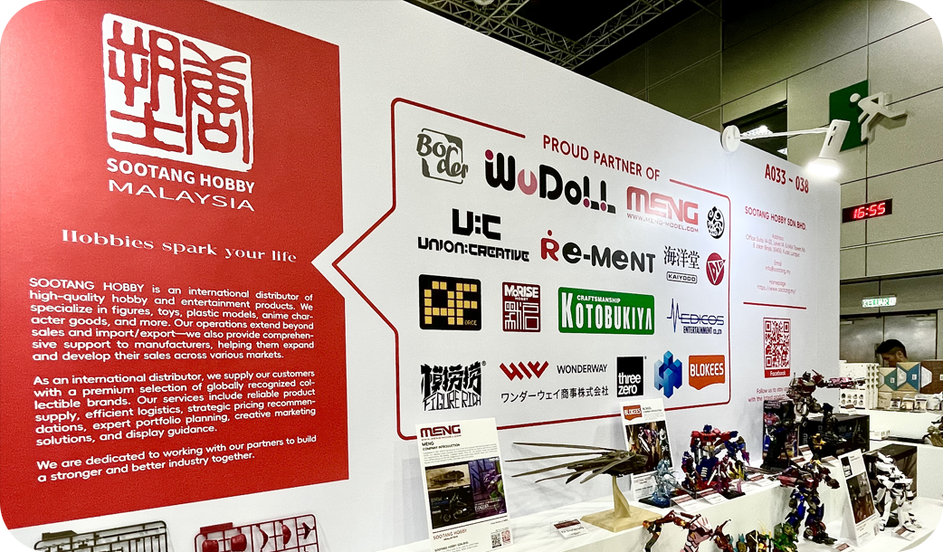 SOOTANG HOBBY IS AN INTERNATIONAL DISTRIBUTOR OF HIGH-QUALITY HOBBY AND ENTERTAINMENTPRODUCTS.WE SPECIALIZEIN FIGURES, TOYS,PLASTIC MODELS, ANIME CHARACTER GOODSAND MORE.OUR OPERATIONS EXTEND BEYOND SALES ANDIMPORT/EXPORT-WE ALSO PROVIDECOMPREHENSIVE SUPPORT TO MANUFACTURERS, HELPING THEM EXPAND AND DEVELOP THEIR SALESACROSS VARIOUS MARKETS.